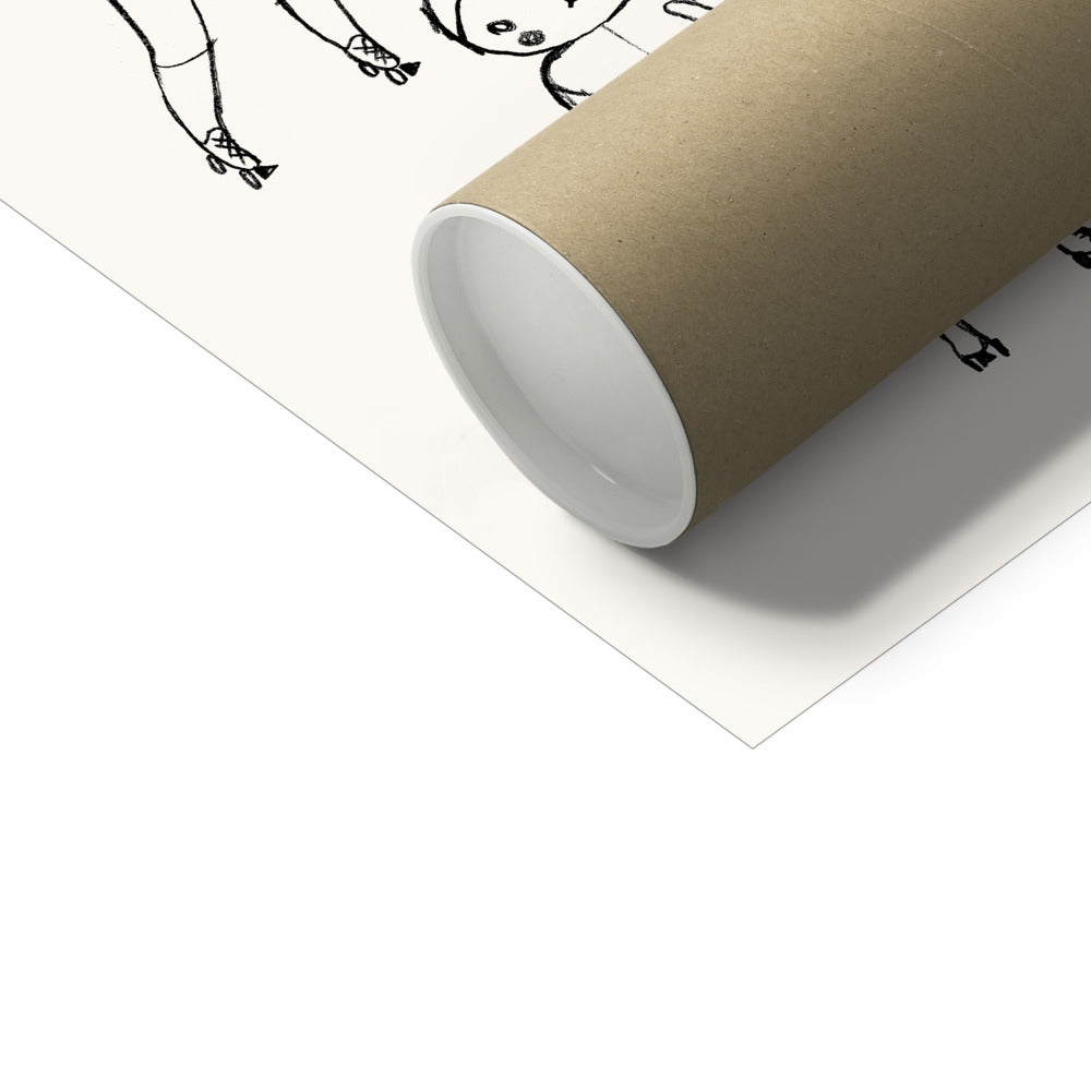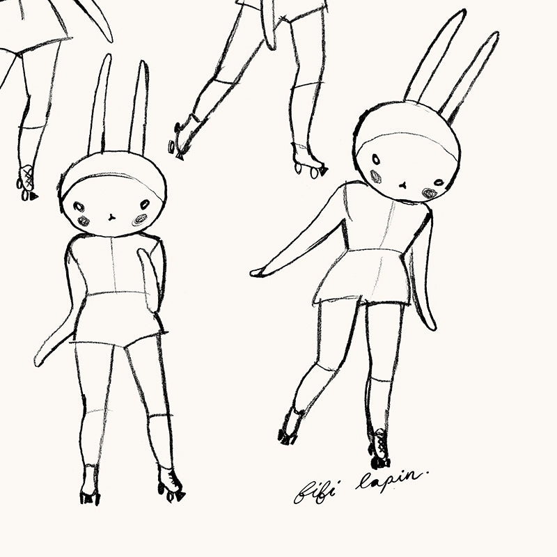 A beautiful fine art print featuring a sketch of Fifi Lapin testing out her new skates printed on 200gsm museum-quality fine art print paper with a lovely textured, matt finish.