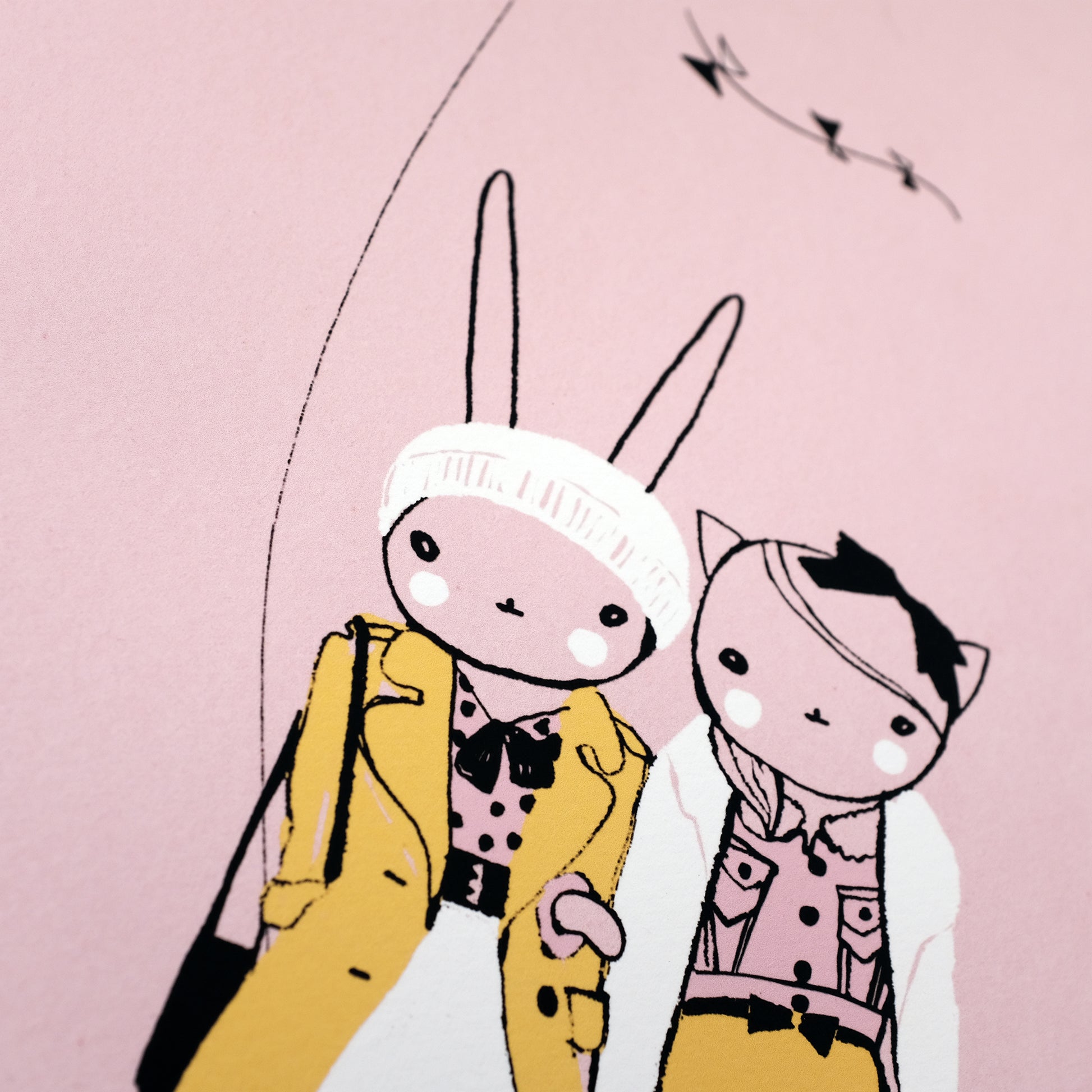 A beautiful fine art print featuring Fifi Lapin and her best friend Ruby Gatta printed on 200gsm museum-quality fine art print paper with a lovely textured, matt finish.